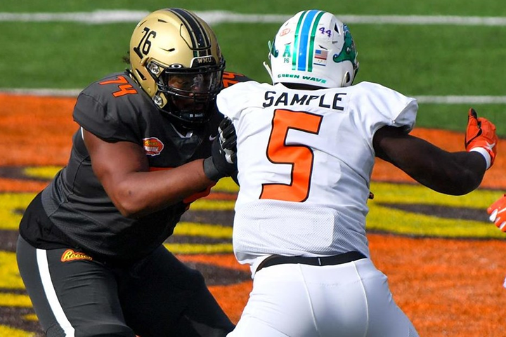 There’s a couple of names every year from small schools, that really create a buzz among scouts with their performance during Senior Bowl week. This year the trendy choice would be this Division III center/guard, who drew the attention with that belly hanging out of his half-jersey, but even more so he made noise with what he did between the lines. The amount of hype he was getting on the broadcast was a little over the top and I had to go back to the practice tape to see more of the O-line, because the camera followed him instead of showing the other reps, but he certainly was very impressive for a D3 prospect. He got some help on a quick combo to set him up, but this guy put Washington’s potential first-round D-tackle Levi Onwuzuruike on his back early on in team drills on day one – That’s how he received my attention. I also liked his natural ability to recover in pass-rush one-on-ones and the strong grip he showed in his hands. Meinerz is not just a great story, but actually was one of the top interior O-linemen in Mobile and he bullied a few guys. You saw him pancake Pittsburgh’s Patrick Jones at one point in pass-rush drills and he routinely created vertical movement on run plays in the team portion of practice. What he does great already as a pass-protector is using good flexion in his joints to really set that anchor and swallow the bull-rush. And I thought he definitely improved from day to day as well, doing it at all three interior spots. The one thing I saw that I didn’t like was how wide he got with that outside land a lot of times and that’s what the refs will flag him for at the next level, when defenders can turn that into jersey tugs. However, he was named the National Team’s Offensive Lineman of the Week and improved his draft stock as much as anybody with that jump in level of competition.