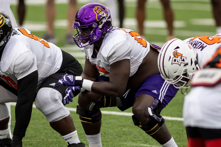 At 6’5” ½, 305 pounds, Radunz was appealing to scouts thanks to his measurements, but more importantly his dominant play at the FCS level. During this week in Mobile, he absolutely showed that he can do it against Power-Five competition as well. Radunz’ movement skills looked very impressive. As a pass-protector, he flies out of his stance and into the kick slide, taking away any easy angle right away. I love how active and well-coordinated his feet are, plus he showed the ability to re-position the hands and recover with natural athleticism. There was one rep, where he got beat on an inside counter and spun himself to get his hands back on the defender and ultimately pancake him. Northern Iowa’s Elerson Smith gave plenty of tackles problems with his quickness, but on the couple of reps Radunz had against him, he did what he already did in their last regular season meeting – he shut him down. My biggest question coming into the week for Radunz was if he had enough sand in his pants and if he could swallow power, especially transitioning from speed and landing the icepick, but that didn’t seem him like much of a problem for him at any point. To me he was the best and most consistent OT of the week at Hancock-Whitney Stadium. I’m still working through a lot of tape and I think there’s plenty of intriguing tackle options in this class, but at this moment I’m only comfortable with four names that I’d definitely put ahead of Radunz. I think this is one of those guys that actually would have benefitted from a full combine, where put his athleticism on display, but the tape and the confirmation against NFL-level players is there.