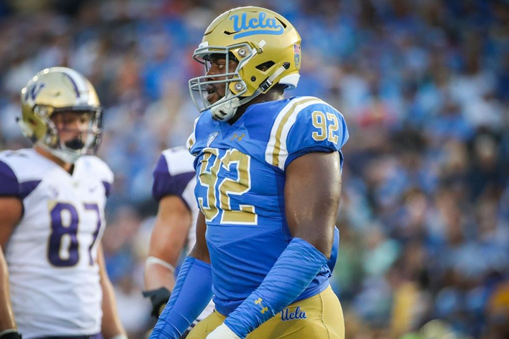 At 280 pounds, you expect a pure upfield penetrator, but Osa displays an all-around skill-set and for his height, that 84-inch wingspan and the 34-inch arms are very good. He primarily lined up shaded to the outside edge of guards in a four-man front for UCLA, but was lined up in the A-gap quite a bit as well, where he wasn’t taken advantage of on many occasions. Odighizuwa plays with good leverage and extension in the run game, while having the incredibly strong lower to hold his ground. He excels at shifting his weight to anchor versus down-blocks and then squeezes down the gaps inside by pushing his man that way, putting that guy on his butt a few times. You actually see him drive some guys, who outweigh him by like 50 pounds, a couple of yards backwards in some short-yardage situations. And then he shows some suddenness to work across the face of blockers, as he sees the ball-carrier try to run through that gap, Osa has a very good understanding and feel for how to deal with double-teams, to where he keeps his hands inside the chest of the first man, but lean into the angular blockers. At the same time, you see him get into the backfield against zone runs with the high swim a few times as well. On those wide zone runs, he at times stops his feet almost and crosses the face of guards, to not let the play flow to the outside, and he displays excellent pursuit from the backfield of those lateral schemes.