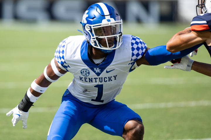 Joseph primarily played boundary corner for UK, but also lined up exclusively on the wide side in a couple of matchups last season, either in soft press-man or cover-three. He displays patient hips – especially when staying balanced against hesitation/stutter releases – and is pretty light on his feet for a lanky corner. Joseph has no issues running with vertical routes (go’s, posts, etc.) and if you need proof of his speed, just check him out almost chasing down the defensive end on his own team on a pick-six against Mississippi State last season. And when he sees his receiver break inside in man-coverage, he gets very physical with putting his hands on the opponent and then wrapping around, to knock the ball down. You also see good fluidity in his lower half, when he is in a three-deep side bail and flips around by 180 degrees, to defend a deep out route. He is pretty springy in zone coverage and doesn’t allow certain route patterns to make him vacate his area. And when he is responsible for a deep third/quarter, he is actively looking for corner routes or anything coming across the field into his zone. When the Wildcats played Florida last year, Joseph was matched up with superstar tight-end Kyle Pitts a whole lot, because the Gators put him at single-receiver, either in-line or split out wide, and while the CB did give up a touchdown on a slick corner-post route early on, for the final three-and-a-half quarter, he pretty much shut number 84 down.
