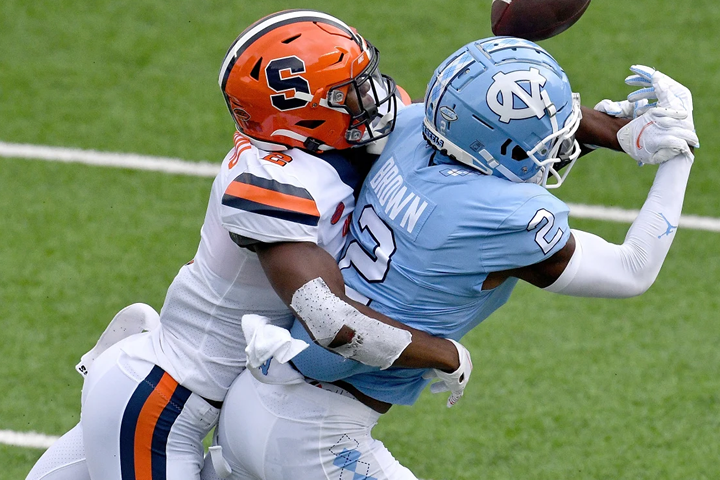 You don’t see anybody get behind Melifonwu in deep coverage and when receivers bend to the post, he stays right in position to trail down the field. When teams try to hit curl or quick-in routes against him in off-alignment, just like the receiver, he keeps working back to the ball. He shows good awareness for when he becomes the hang-defender in cover-three and can peel off his area, to make plays on the ball. In the 2020 Liberty game, where Syracuse gave up 38 points, he wasn’t responsible for a single catch and never let any receiver get a step on him vertically. Other than a couple of quick in-breaking routes when he was in cover-three, Melifonwu also didn’t allow North Carolina’s Dyami Brown to really get anything going being right in his hip pocket and showing little issues carrying him down the field. His competitiveness at the catch point really stood out in the Senior Bowl game on a few occasions. Melifonwu crashes into blockers on screens and toss plays. He consistently stacks and sheds receivers trying to block him and delivers some big hits when the ball comes out quickly, while not letting receivers get outside of him usually and wrapping up effectively. He only missed five of 59 tackling attempts last season. And he doesn’t show any hesitation trying to run through backs when he’s sent as a blitzer.