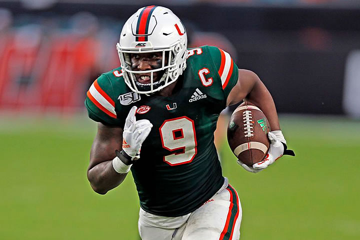 This guy has some serious burst off the snap and he is a threat to attack down the hashes. Jordan does a nice job of bending his seam routes and quickly giving the quarterback a sign when he’s running free over the middle, while truly splitting the safeties in two-high shells. He was open on shallow post and dig routes a lot and often times didn’t get the ball. Against man-coverage, I like how Jordan can nod one way and force defenders to open up their hips, before breaking the other direction. He shows urgency to push vertically from the slot position and then creates separation by snapping off for curl or hook routes. Last season, he averaged 2.93 yards per route run versus man-coverage and a passer rating of just under 140 when targeted overall. Jordan plucks the ball away from his frame consistently and then is a threat to quickly pick up yards after the catch, especially catching the ball in the flats, as he instantly gets vertical and shows good awareness for defenders around him. He’s pretty shifty with making guys miss, even when corralled by multiple defenders, and doesn’t mind lowering the shoulder on an awaiting defender, constantly falling forward for a couple of extra yards. In 2019, 13 of his 35 receptions (37 percent) included at least 10 yards of additional yardage after the catch, Overall, he broke 21 tackles on 105 catches in career. On a day where Miami got embarrassed at home by North Carolina late last season, he was the only one producing for the Canes, catching six balls for 140 yards and a score.