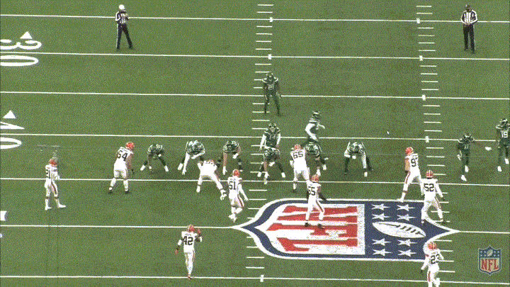 In the pass game, Becton features a seemingly unbreakable anchor and with his massive frame, combined with those 35 ½-inch arms, he is really tough to get around. When you watch edge rushers try to convert speed to power, the Jets’ left tackle often times completely swallows them up, and when he lands a solid punch or stab, he can just stun guys. Becton also has the lateral agility to take over B-gap rushers on T-E twists, but I have also seen him not be able to switch responsibilities with the guard anymore and still stick with the end on the inside loop enough, to allow the quarterback to step up, away from it. At times it also comes into play, when he has to comply to “biggest threat first” and switch to linebacker blitzing the inside gap, as his end drops out. As I’ve already mentioned, Becton is still far from perfect technically. There are times you see him take some false steps or have a rusher land that long-arm underneath his pads, but he has the balance to recover and get the job done regardless.