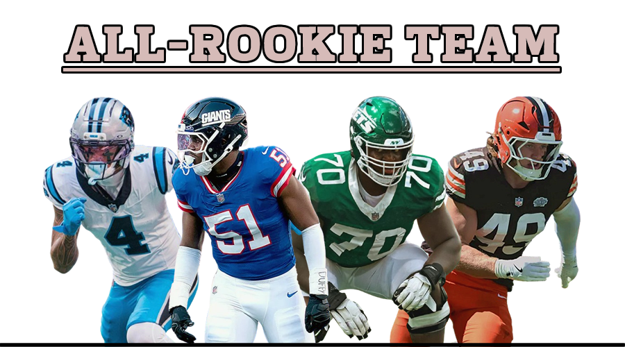 In terms of the receiving corp, I went with two wide receivers and tight-ends, as numbers three to six in aerial yardage were actually labelled as “TEs”. McMillan and Egbuka led the way with 1014 and 938 respectively. The latter winning Offensive Rookie of the Year almost felt like a foregone conclusion at midseason, yet then he only averaged 32.6 yards and didn’t reach the end zone once over the final eight weeks (six beforehand). Regardless of his involvement down the stretch, it doesn’t take away from the savvy and level of detail in his routes. That race for the award probably was decided towards T-Mac thanks to his consistency all year, despite some ups and downs from his quarterback. He cracked 60+ yards in ten games and reached the end zone once more than his NFC South rival (seven). What stood out about him was the quick development of his footwork at the level, how he could reduce his height to be efficient at the break-point, yet then maximize it in order to secure imperfect ball-placement. The one thing that’s a little disappointing for both rookie receivers – they were only right around a 30% contested catch rate. As for the two tight-ends, Loveland and Fannin shone in quite different areas and were also deployed rather differently. I chose the Bears standout as my more traditional in-line Y, because he was easily the best run-blocker among the three names in consideration (68.6 PFF grade), yet if I wanted to put three WRs on the field, he’s shown that he’s absolutely capable of lining up as the single receiver on the backside and winning one-on-one. He actually finished behind only his teammate Luther Burden III in yards per route run (1.86) among all rookies with 20+ targets, he only dropped one pass, and even though this list is based on the regular season, Loveland posting a higher receiving total (137 yards) than Travis Kelce’s best playoff game ever, in his first such opportunity, just illustrates what he’s capable of as a super flexible separator. Fannin functions as more of a movement “F” type, since he’s much more effective off the ball, motioning him before and at the snap to give him running starts and allow his yards-after-catch skills shine. I would’ve even liked to run 13 personnel with this group, because Tyler Warren was on pace for winning OPOY midway through the year, and is nearly every bit as deserving as the two guys who actually made the starting lineup, having outproduced them in catches (76) and total yardage (817). Yet the other two were hauled in right around half of their contested targets compared to Warren’s 39.1% rate, and the separator for Fannin – he had more than four times as many missed tackles forced (22), as someone who’d routinely shake off defenders.